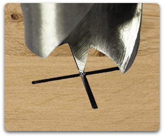 2. Die Vorschneider durchtrennen die Fasern und sorgen für ein kreisrundes Bohrloch. Die Bohrschneide kommt nach der Vorschneide zum Einsatz und entfernt das innenliegende Material.