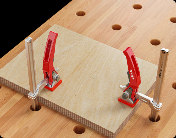 Du hast ein Lochraster in der Werkbank? Dann kannst du das Material mit der Zwinge einfach fixieren.